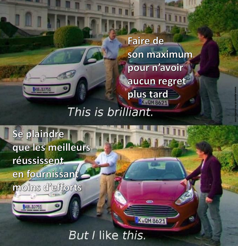 D’ailleurs, certains camarades vous sembleront indépassables. « Ce n’est pas possible, je travaille d’arrache-pied, lui ne fait rien et il y arrive beaucoup mieux que moi. » Rappelez-vous que vous ne partez pas, au départ, à égalité en termes d’aisance mathématique. À la rigueur, on se contrefiche de savoir l’avantage comparatif d’Untel par rapport à vous vient d’aptitudes innées ou d’acquis des années précédentes. Ça ne change pas grand-chose de savoir d’où vient cet écart. Je dirais limite si on pouvait remonter le passé pour savoir : « Lui, il a fait ça en CM2 » ou que sais-je. Oui, si on pouvait remonter le temps et faire comme lui, peut-être que ça n’aurait rien d’intérêt, mais on ne peut pas.